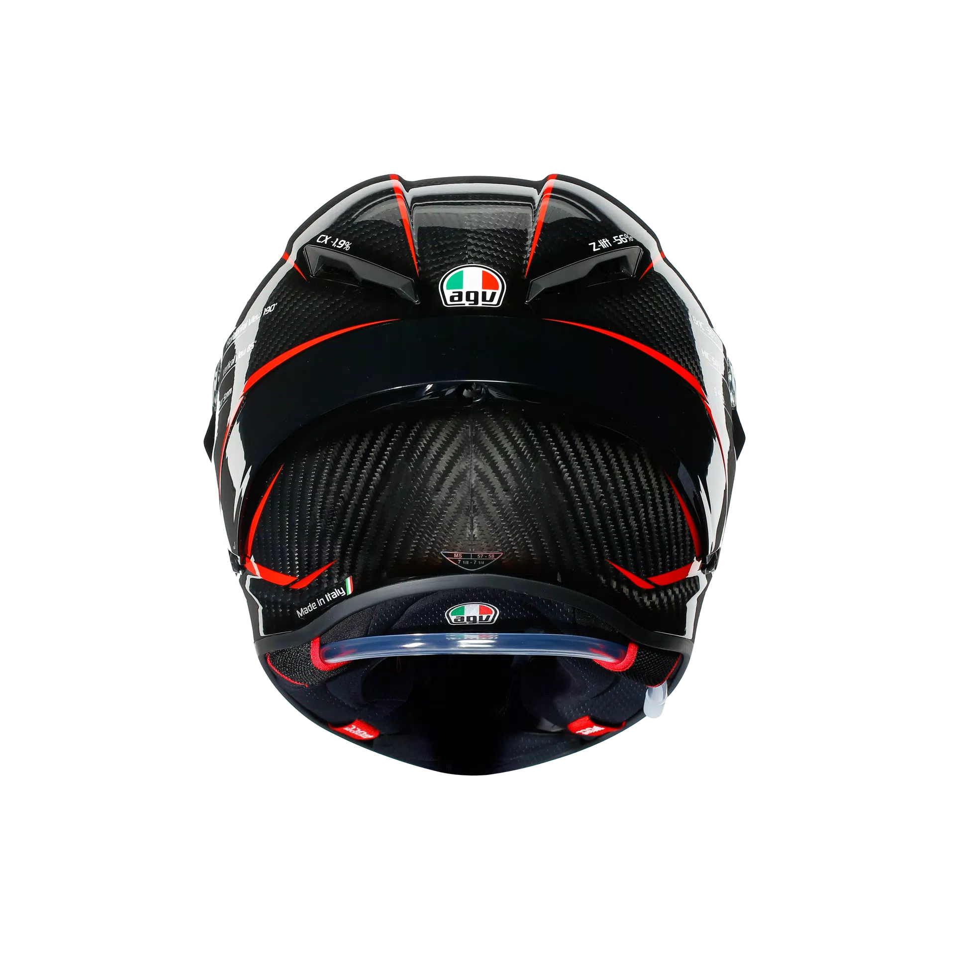 Every detail is designed to ensure ultimate performance. The Extreme Carbon shell in 100% carbon fiber guarantees extraordinary lightness, which makes it effortless to wear. Its shapes and metal air vents are studied in the wind tunnel and tested by AGV athletes in order to ensure the best aerodynamic penetration and the greatest stability at high speeds, also due to the innovative profile of the rear PRO Spoiler. Boasting 5 mm thickness, the optical class 1 Ultravision visor is an integral part of the protector that allows 190° panoramic vision, and 85° vertical vision. This means the rider sees the track, adversaries, and obstacles more clearly, before anyone else, even in racing position tucked into the frame.
